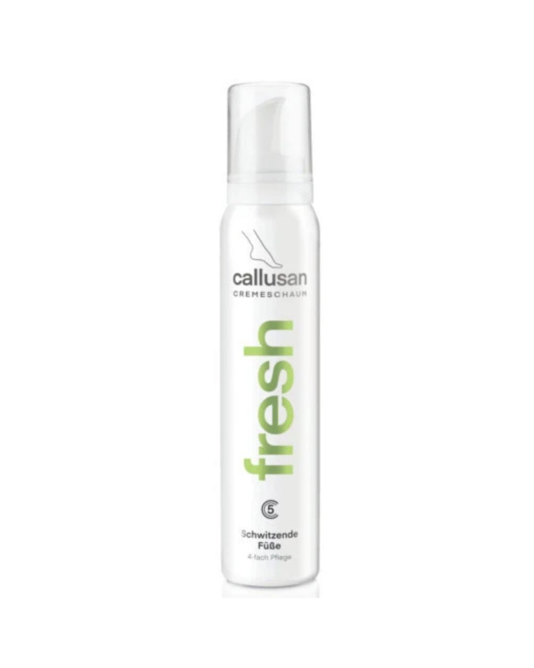 Callusan Fresh to innowacyjny krem w piance stworzony z myślą o pielęgnacji stóp z tendencją do nadmiernej potliwości i nieprzyjemnego zapachu. Jego czterofazowa formuła łączy działanie nawilżające, odświeżające, ochronne i antyseptyczne, zapewniając długotrwałe uczucie czystości i komfortu. Naturalne składniki – olejek z szałwii, mentol, olejek ze skórki gorzkiej pomarańczy, masło shea, olej z awokado i jojoba – dbają o równowagę skóry, przeciwdziałają rozwojowi bakterii i pozostawiają stopy miękkie oraz świeże przez cały dzień.