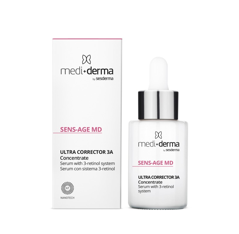Sens-age Md Ultra Corrector 3A Concentrate serum liposomowe z systemem 3-retinol 30 ml to pielęgnacja o silnym i globalnym działaniu przeciwstarzeniowym. Połączenie systemu 3 retinol z czynnikami wzrostu stymuluje i wspiera syntezę kolagenu i elastyny, chroni włókna kolagenowe oraz poprawia integralność skóry i naskórka. Formuła jest wzmocniona składnikami o działaniu antyoksydacyjnym: ergotioneiną i resweratrolem.
